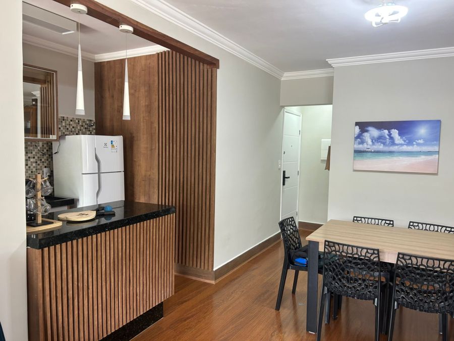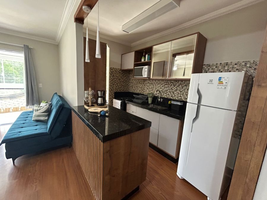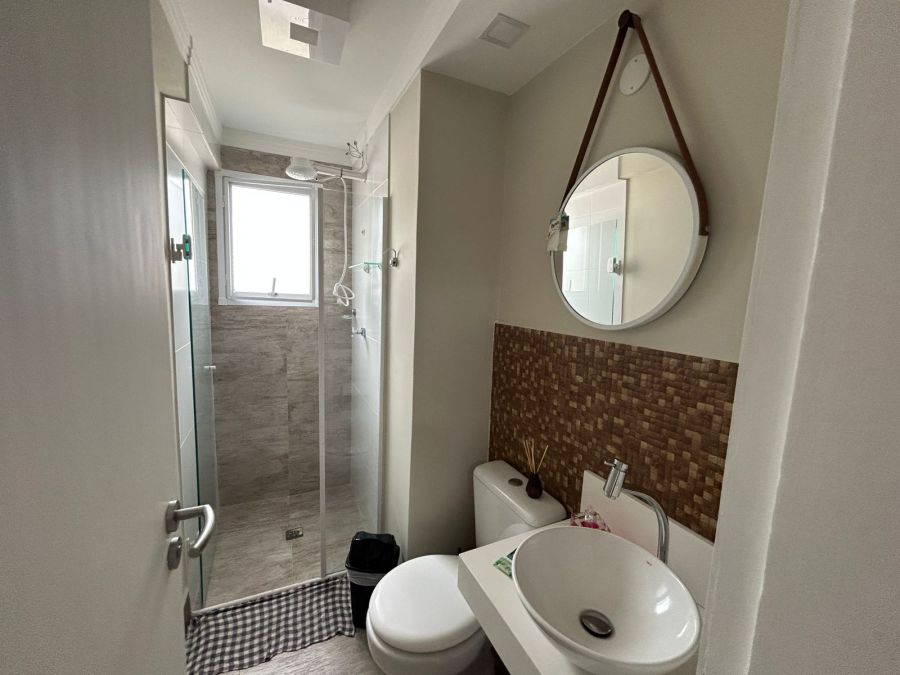A unidade dispõe de dois dormitórios, sendo uma suíte bem iluminada, garantindo privacidade aos moradores. O layout interno inclui dois banheiros, área de serviço independente e uma sacada que favorece a ventilação natural e a luminosidade dos ambientes. Para maior comodidade, o imóvel conta com uma vaga de garagem.